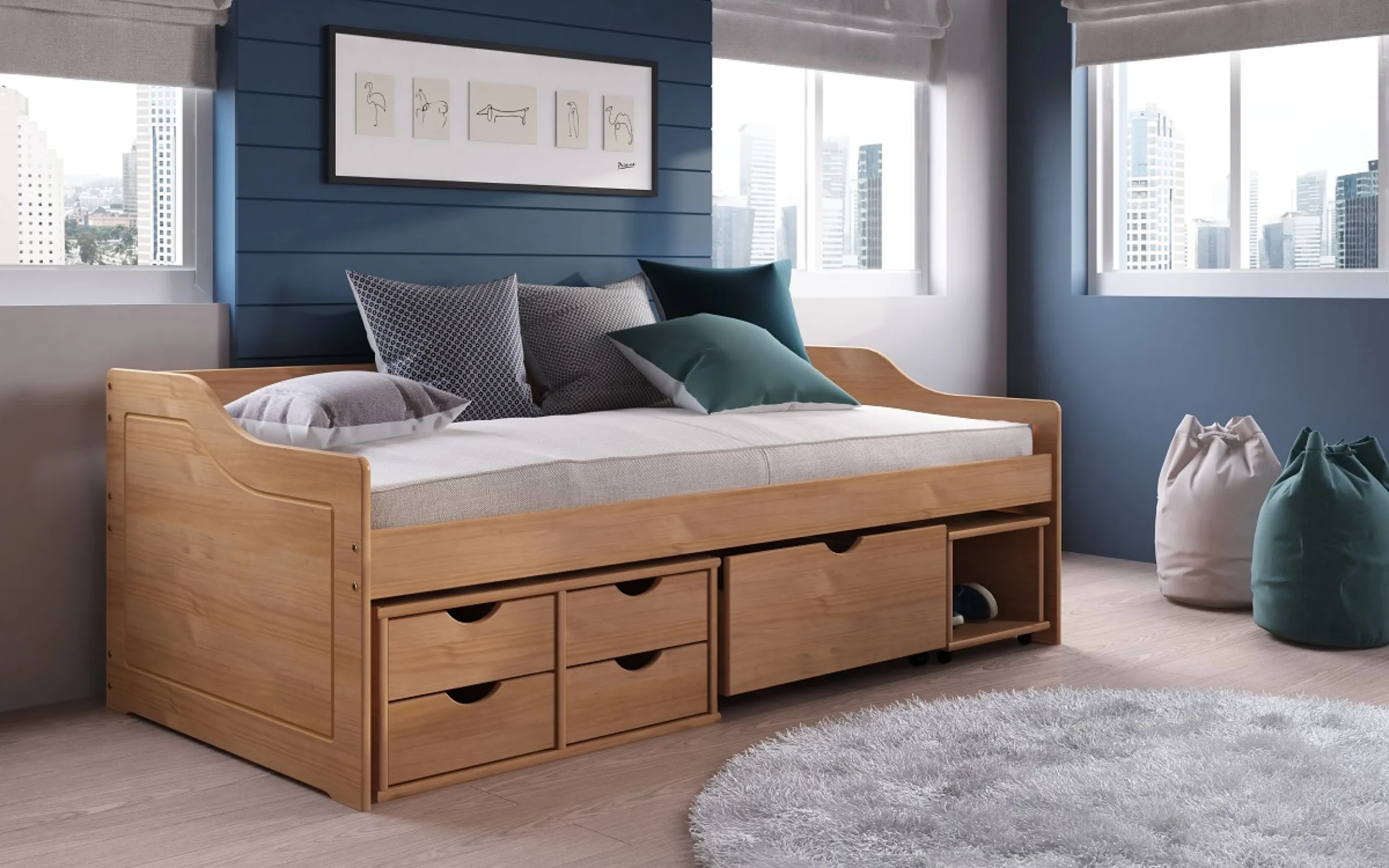 Camas com gavetas e bicamas que encantam quem precisa unir conforto e praticidade.